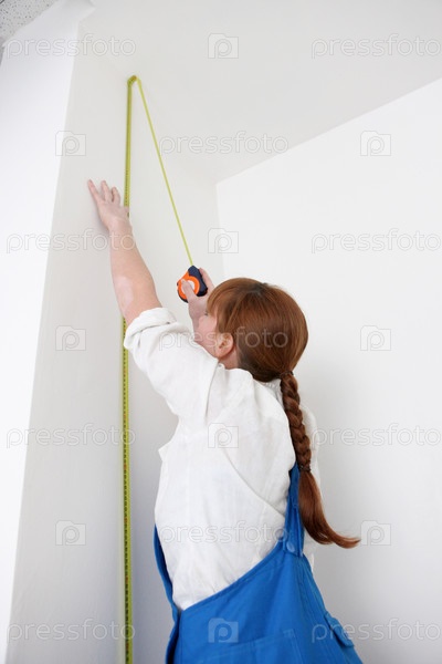 Женщина, измеряющая стену