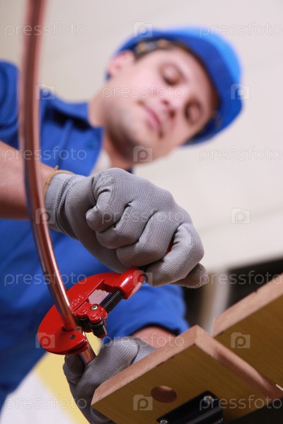 Рабочий использует инструмент для подготовки медной трубы