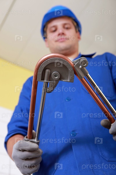 Рабочий использует инструмент для подготовки медной трубы