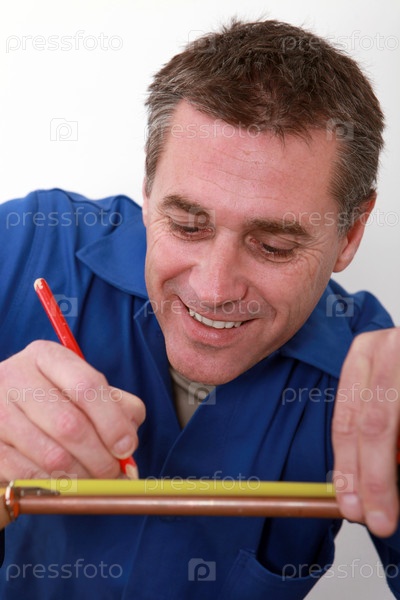 Сантехник измеряет медные трубы