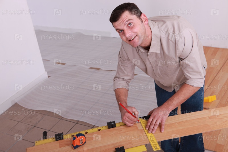 Рабочий укладывает паркет