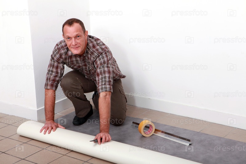 Мужчина укладывает ковровое покрытие