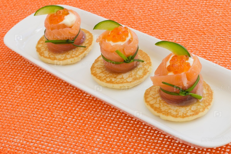 Роллы из лосося, сыра, икры и огурца на оладьях на оранжевом фоне