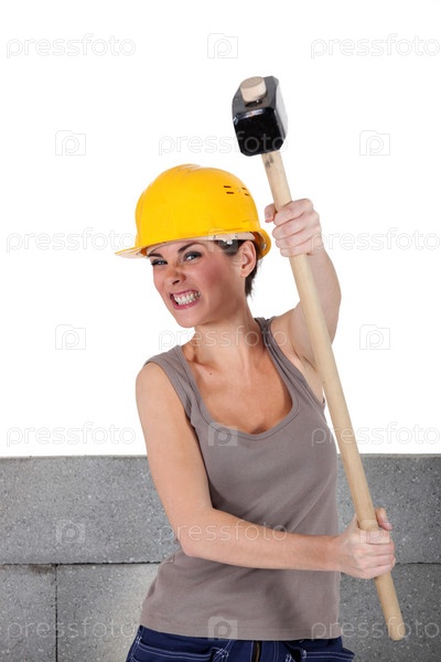 Женщина-каменщик держит кувалду