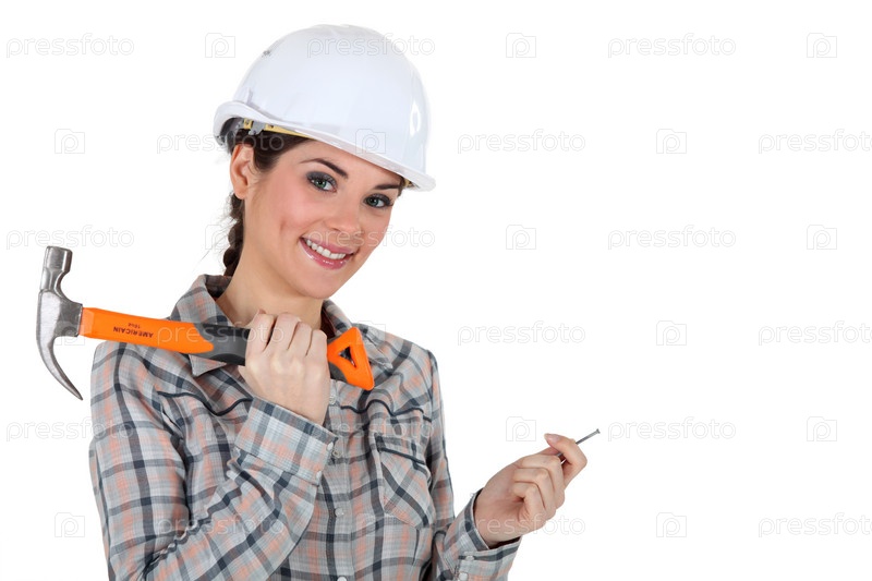Рабочая держит гвоздь и молоток