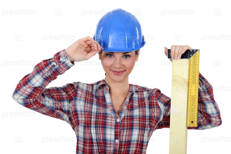 Женщина-плотник в каске с линейкой