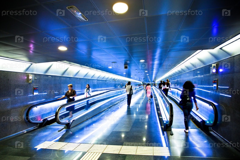 Синий подвижный эскалатор с людьми в Барселоне