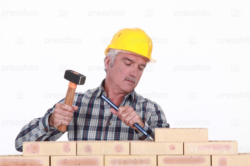 Рабочий работает с помощью молотка и зубила над стеной