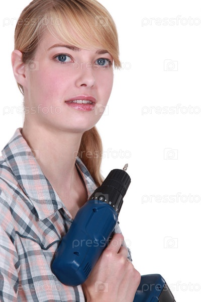 Рабочая женщина держит дрель