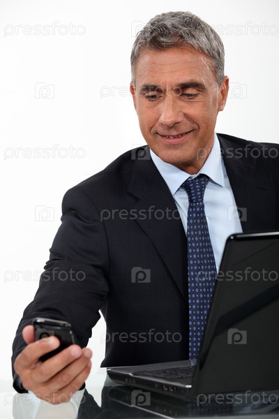 Пожилой бизнесмен с ноутбуком и мобильным телефоном