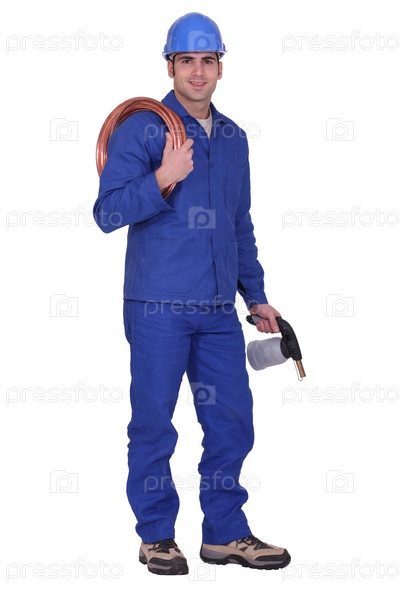 Мужчина, держащий моток медных трубопроводов и паяльную лампу