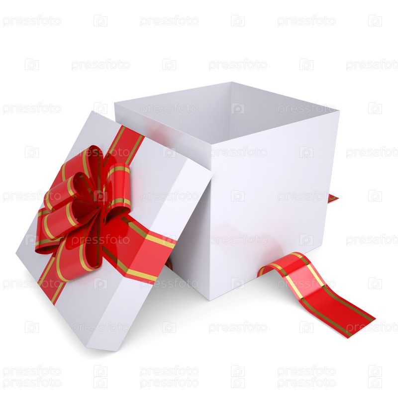 Открытый белый подарок, оформленный красной лентой