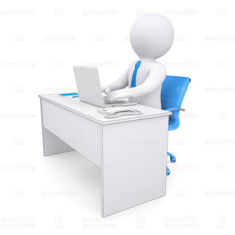 Трехмерный белый человек, работающий на ноутбуке за столом