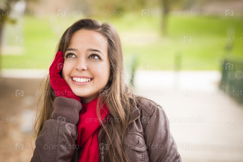 Портрет симпатичной девушки в красном шарфе и варежках на улице