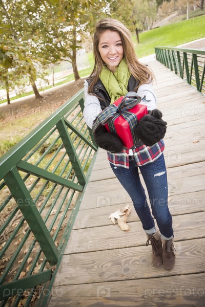 Красивая женщина с упакованным подарком с бантом на улице