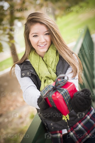 Красивая женщина с упакованным подарком с бантом на улице
