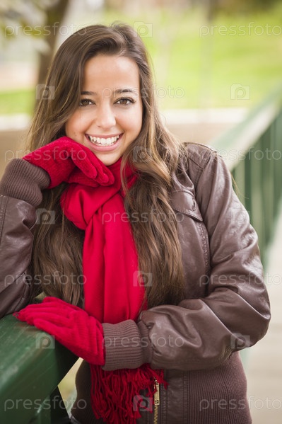 Портрет симпатичной девушки в красном шарфе и варежках на улице