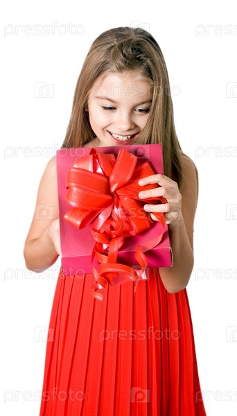Девочка открывает красную подарочную коробку