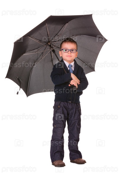 Мальчик в черной одежде стоит под зонтом