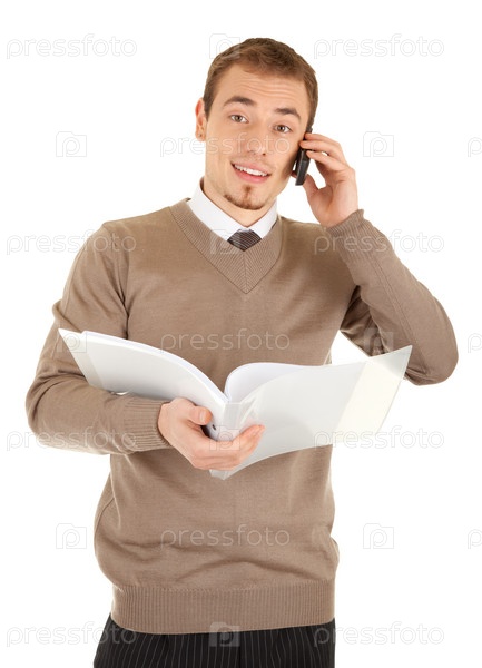 Менеджер с папкой документов говорит по телефону