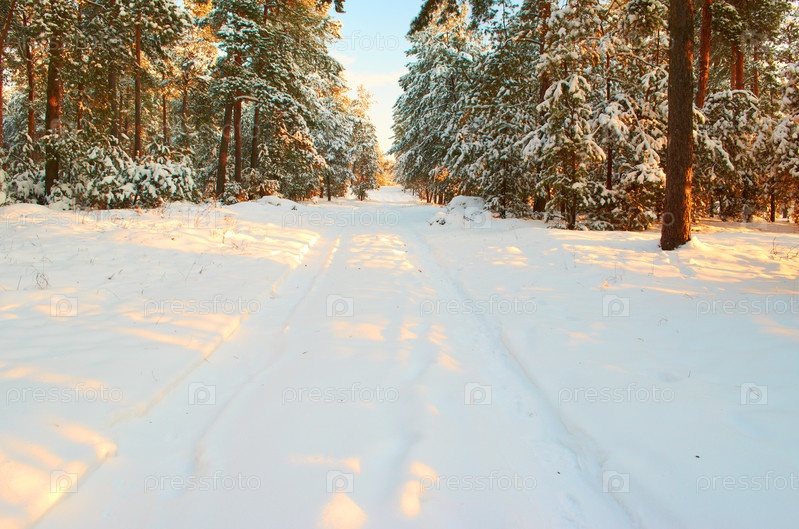Морозное зимнее утро в сосновом лесу