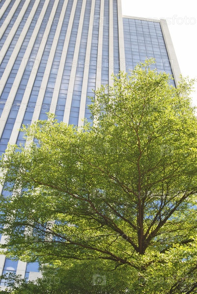 Зеленое дерево на фоне высокого офисного здания
