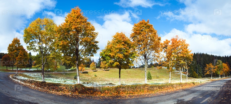 Первый зимний снег и осенние яркие деревья у горной дороги