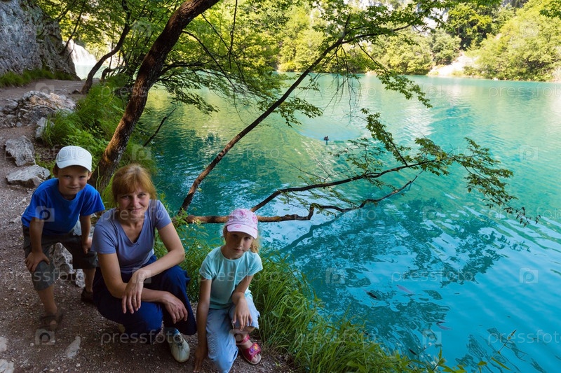 Семья летом у прозрачного бирюзового озера. Плитвицкие озера, Хорватия