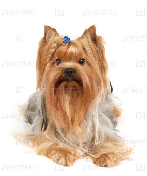 Йоркширский терьер с косичкой на белом фоне