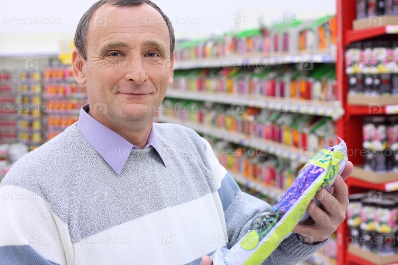 Пожилой мужчина в магазине с пакетом в руках