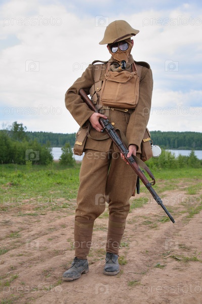 Солдат 1-й Мировой войны в противогазе и с винтовкой