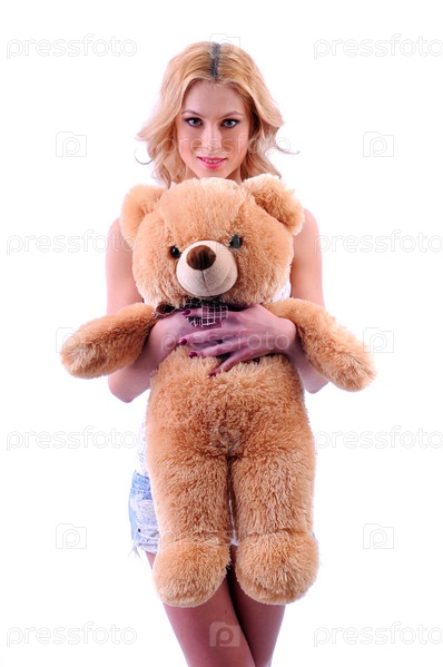Красивая девушка с плюшевым мишкой на белом фоне