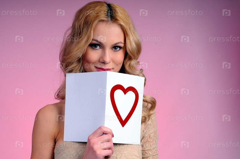 Девушка с поздравительной открыткой на розовом фоне. День Святого Валентина