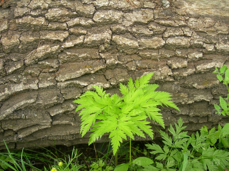Зеленые листья на фоне коры дерева