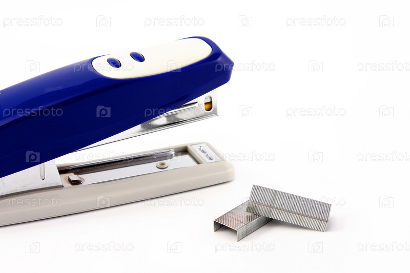 Степлер и скрепки на белом фоне