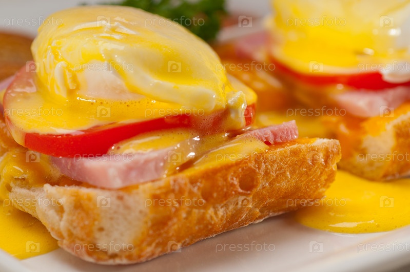 Яйца бенедикт на хлебе с помидорами и ветчиной