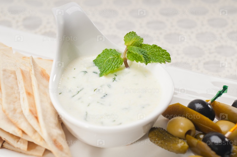 Греческий йогурт цацики, соус и хлеб пита