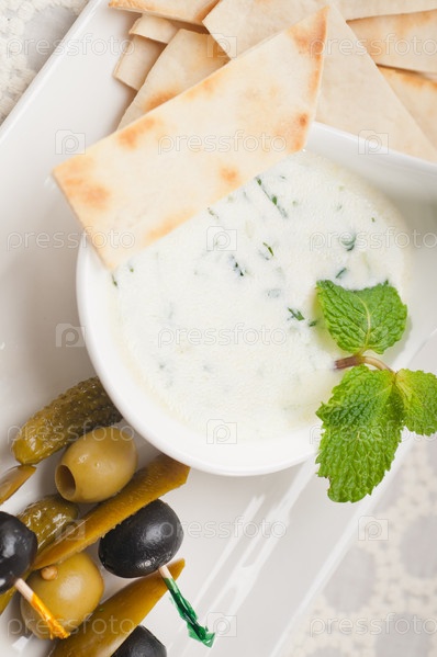 Греческий йогурт цацики, соус и хлеб пита