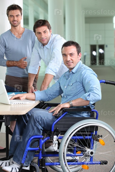 Мужчина в инвалидной коляске с коллегами