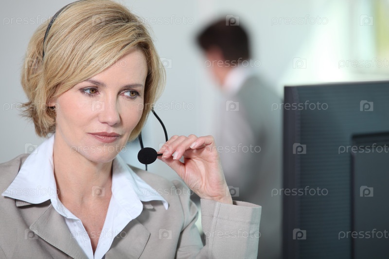Женщина в гарнитуре работает на компьютере