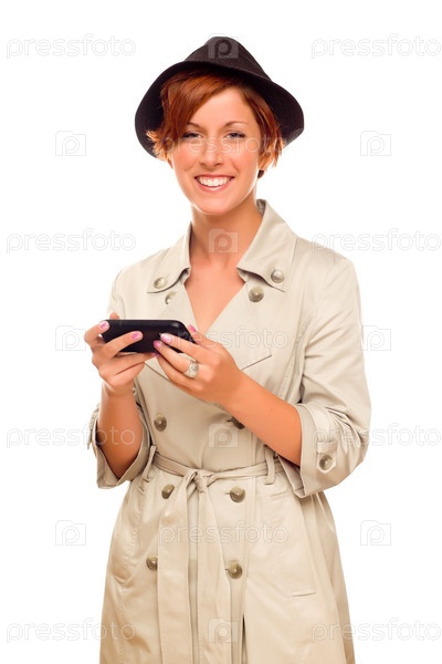 Улыбающаяся молодая женщина, держащая смартфон, на белом фоне