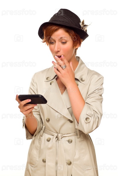 Улыбающаяся молодая женщина, держащая смартфон, на белом фоне