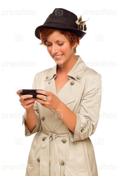 Улыбающаяся молодая женщина, держащая смартфон, на белом фоне