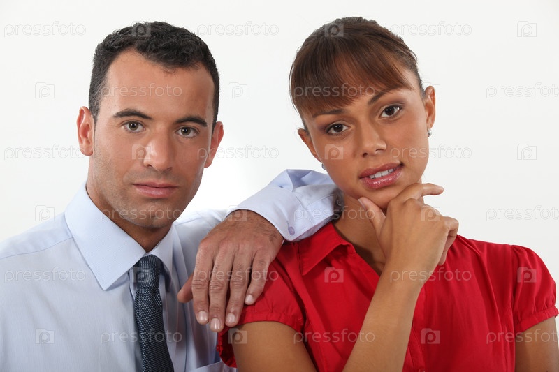 Молодой бизнесмен и бизнес-леди позируют вместе