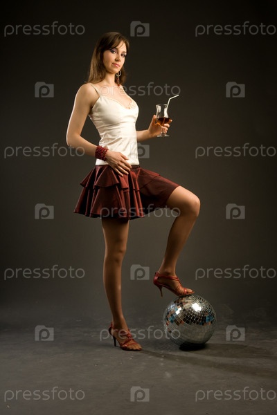 Портрет красивой девушки с коктейлем и зеркальным шаром