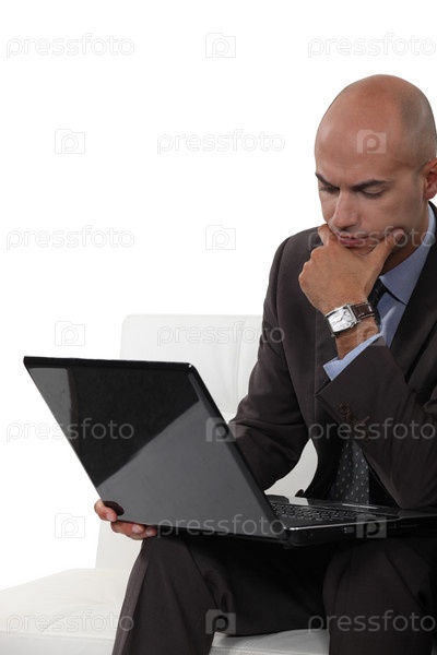 Задумчивый лысый мужчина с ноутбуком