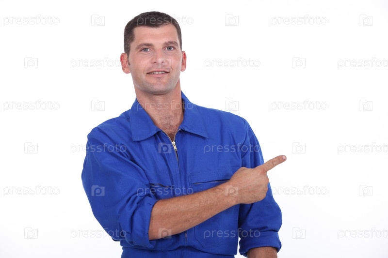 Ужчина в синем комбинезоне указывает на белый фон