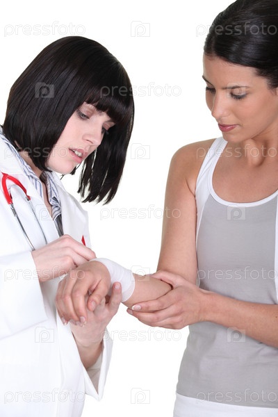 Медсестра накладывает повязку на руку пациентки