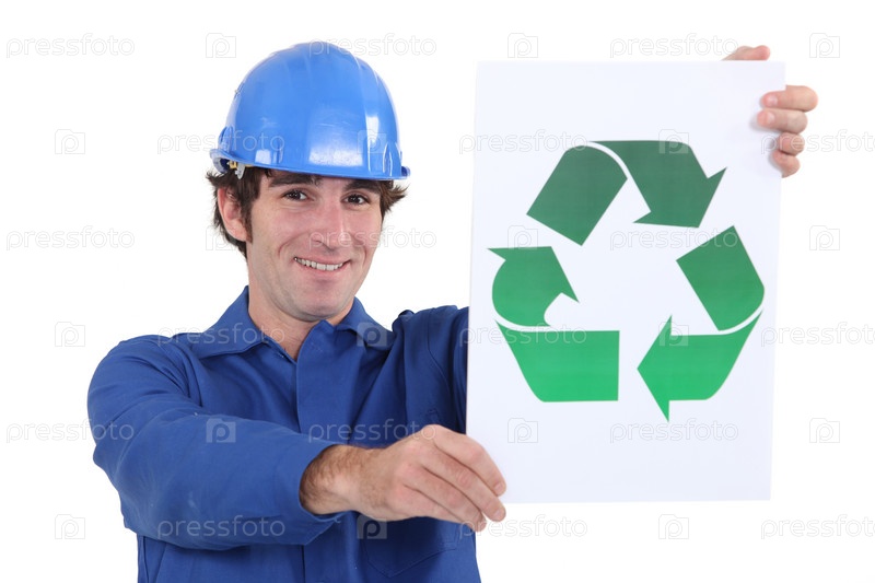 Строительный рабочий поощряет рециркуляцию для планеты
