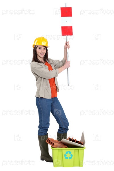 Рабочий поднимает дорожный знак над корзиной для утилизации